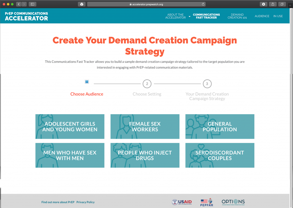 The PrEP Communications Accelerator uses a simple “wizard” flow to allow a user to quickly drill down into audience and context for tailored strategies.